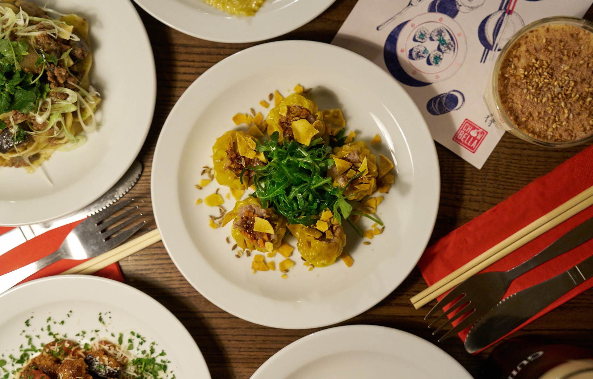 Mum’s aubergine hotpot instantly transports us back to childhood. She learnt it from Grandma, but years in England – and fiercely Italian instincts – turned it into something closer to a bolognese. We didn’t realise how different it was until we ordered it in a Chinese restaurant. Hers is better. It’s the dish that inspired Chow Bella and sits first on our menu. We took it to school in flasks while other kids turned their noses up – though we knew they’d swap their sandwiches if they dared.