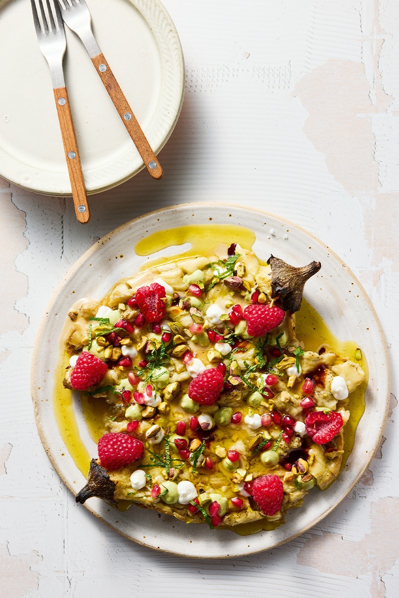 Transfer the aubergine to a plate, and flatten with the side of a knife. You want a rustic, uneven layer (not too neat). Squeeze over the lemon juice and sprinkle with sea salt. Drizzle over the tahini and follow with the date molasses. Scatter over the pistachios, pomegranate seeds and raspberries (don’t skip them, they cut through the richness beautifully). Dot with the yoghurt (if using) and finish with a glug of olive oil.