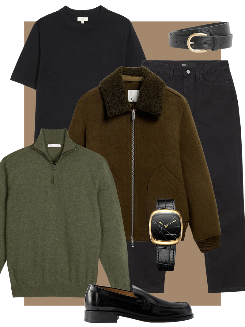 Here’s an office-ready outfit with elegance. The durable, soft merino-wool quarter-zip is the anchor, while the cashmere field jacket, nubuck gloves and leather briefcase bring elements of class.
