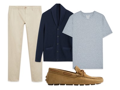 A chunky cardigan + chinos + loafers = a comfortable, stylish everyday look. For a contemporary take, oversize the cardi and go for slim chinos.
